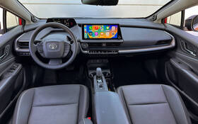 The Prius offers a proper driving position, but the tiny steering wheel finished in matte leather is connected to a fairly lightweight and vague steering that lacks on-centre feel. That’s a shame, because the nimble, AWD-equipped Prius effortlessly attacks corners and isn’t prone to understeer despite what the squealing, low-rolling resistance tires may suggest. The body feels solid and ride quality on bumpy surfaces isn’t bad at all.