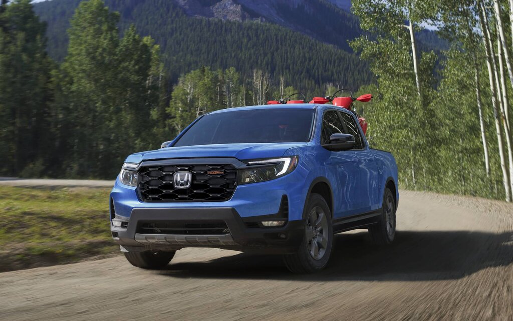 The Ridgeline is the only midsize pickup with a unibody construction, which results in a more SUV-like driving experience but also reduces towing capacity (max. 5,000 lbs). Under the hood is a 3.5-litre V6 engine that produces 280 horsepower through a nine-speed automatic transmission. Model selection includes Sport, Black Edition and TrailSport, the last one aimed at off-road enthusiasts. The versatile 5.3-foot cargo bed features a lockable and weatherproof trunk under the floor.