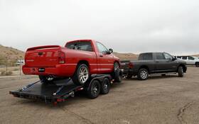 The highlight of the day was undoubtedly the towing test involving a 2025 Ram 2500 Laramie equipped with the Cummins turbodiesel engine pulling a trailer with a V10-powered 2004 Dodge Ram SRT-10 pickup on it. The total load was just 8,100 lbs and it showed when accelerating. With all the available low-end torque, the truck made the job look easy the entire time.